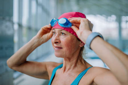 Close-up of senior woman putting on goggles before swim in indoors swimming pool.