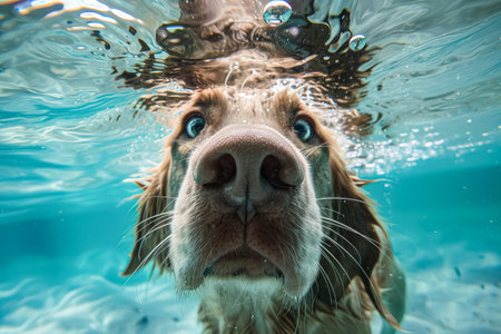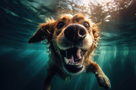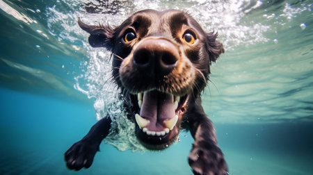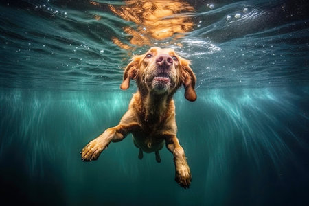 Underwater funny photo of dog, dive deep down. Summer vacation with pet. Closeup underwater photo of a dog. Activities, training classes with dogs. Generative AI illustration