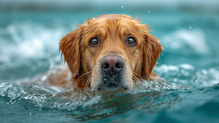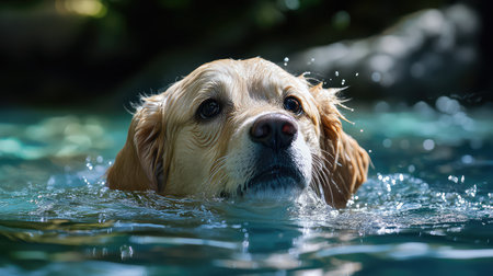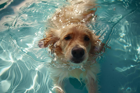 Cute golden retriever enjoys a refreshing swim in clear blue water on a sunny day