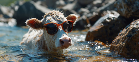 Cow wearing sunglasses on the water.