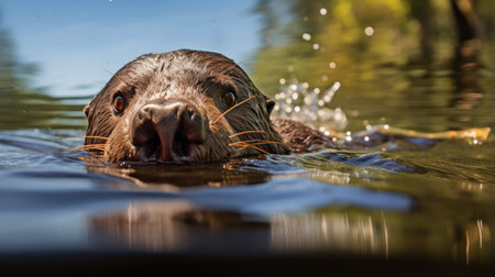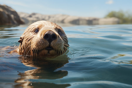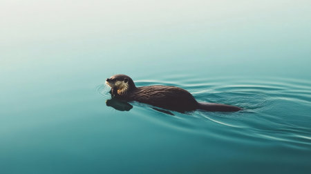 A charming otter swims in serene waters, showcasing its playful nature as it glides through calm surroundings. The tranquil setting highlights the beauty of wildlife.