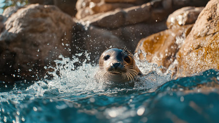A charming seal creates splashes while swimming in clear blue water. The scene captures nature's beauty and marine spirit against a rocky backdrop.