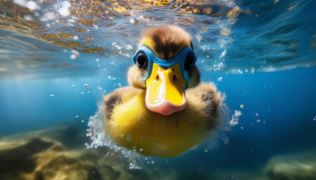Playful duck swimming with glasses, showcasing a fun and quirky personality in a serene underwater setting with bubbles, ideal for animal lovers and children s themes