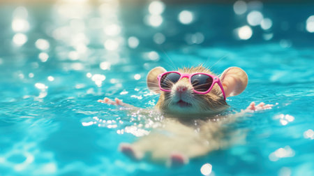 A mouse floats effortlessly in a bright turquoise pool. Summer vacation concept