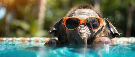 Baby elephant with sunglasses in a pool, tropical backdrop, bright sunny day, playful and vibrant