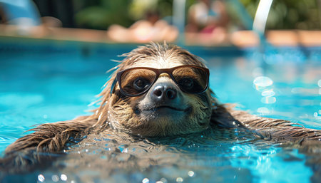 Sloth in sunglasses floating in a pool, relaxing, wideangle