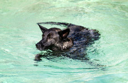 Dutch Shepherd swimming in a swimming pool in summer