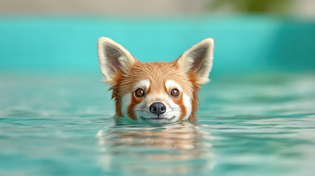 A charming red panda with wet fur and alert eyes, peeking out of the water, looking directly at the viewer with a curious expression.