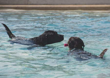 Labrador retriever swims in the water in the summer.