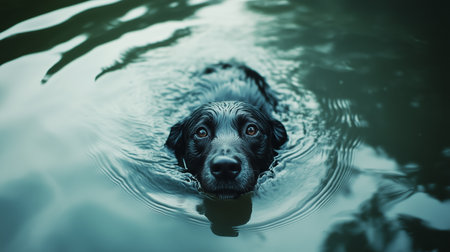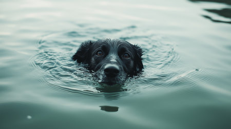 A black dog paddles in calm water on a serene day, enjoying a refreshing swim in the lake during late afternoon