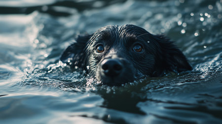 A black dog swimming in clear water on a sunny day, enjoying a refreshing summer outing at the lake