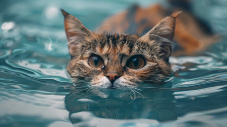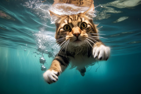 Adventurous and playful tabby cat enjoying an underwater swimming adventure in a domestic aquatic environment, showcasing its curious and brave behavior