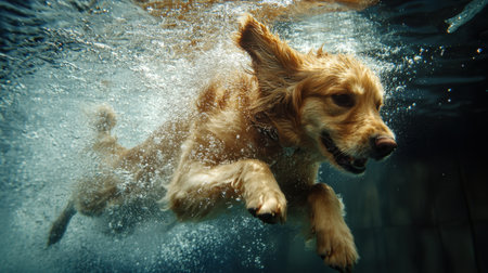 Playful dog mid-jump into a pool, underwater view capturing its joyful expression and splashes as it enters the water.