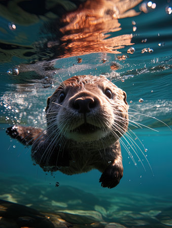 This captivating image features an adorable otter swimming gracefully underwater, capturing the essence of marine life. The sunlight and bubbles create a vibrant atmosphere.