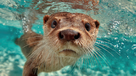 A curious otter swims gracefully in clear water, showcasing its playful nature and engaging expression, offering a glimpse into the enchanting underwater world.