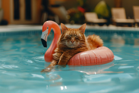 A cat is floating on a pink inflatable flamingo in a swimming pool. The cat appears to be relaxed and enjoying the water