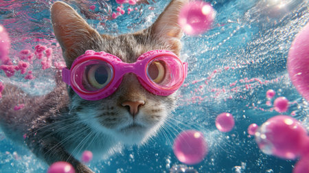 Dive into a playful underwater scene featuring a curious cat wearing pink goggles. Surrounded by colorful bubbles, this vibrant image captures the joy and adventure of exploring the aquatic world.