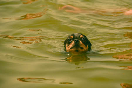 Chihuahua dog breed. portrait of a cute purebred puppy chihuahua in the river. Brutal dog black and brown and white swims. Dog during water treatments. Dog swimming. Camping