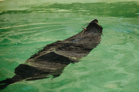 Aquatic view of a sea lion floating on the surface of green pool water in a zoo enclosure