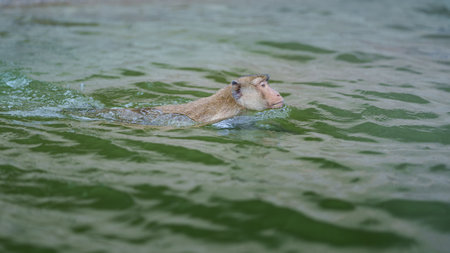 One monkey or Macaca was having enjoy swimming alone on the river, showing only his head and looking at Monkey Island, Kaeng Krachan National Park, Phetchaburi, Thailand. Leave space for text input.