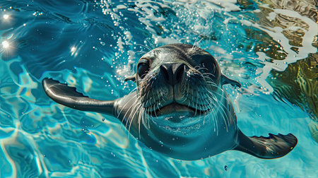 Funny sea lion swimming underwater in the ocean. Animal theme. AI Generated.