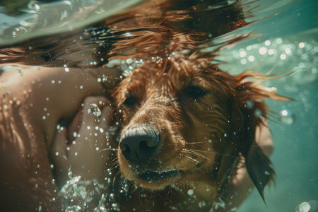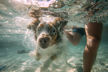 Playful dog and owner diving underwater, enjoying summer splash and fun together in joyful activity