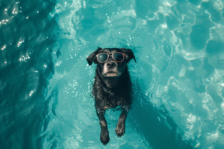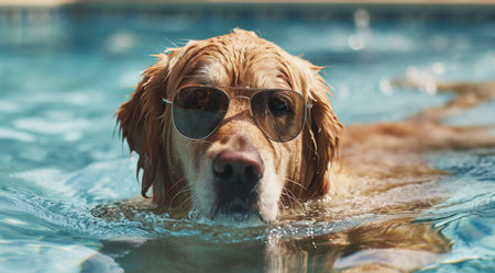 cool dog in pool with sunglasses.