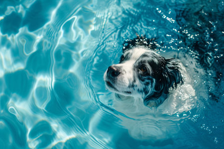 Dog floating in a swimming pool. Happy pet swim, play in the water. Travel, summer vacation