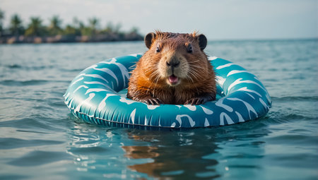 Cute beaver swims in an inflatable ring at sea