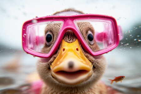 A playful duck wearing pink swimming goggles, swimming joyfully in a pool, showcasing a fun and vibrant atmosphere perfect for children s themes
