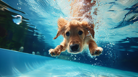 Underwater funny photo of golden retriever puppy in swimming pool.