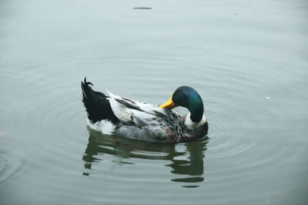 Duck on the water in the park. Beautiful duck swims in the lake.