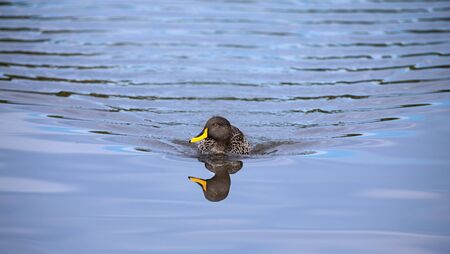 Lone Yellow billed duck swimming on the surface of a pond