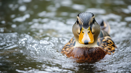 a duck swimming in the water, mouth open, showcasing soft edges and blurred details. captured by matthias haker, this close-up shot emphasizes the duck's facial expression. the image features a lens flare and vray tracing, adding a touch of artistic flair. the duck's nature-inspired camouflage blends seamlessly with its surroundings. ai generated