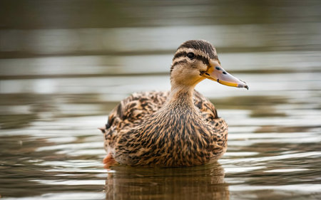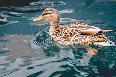 Female mallard duck swimming in the lake. Shallow depth of field.