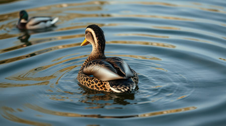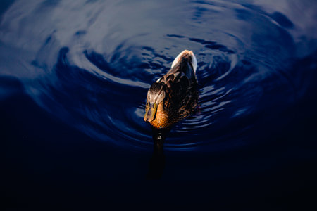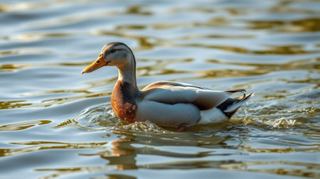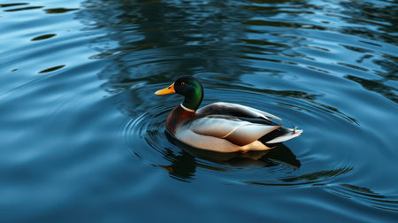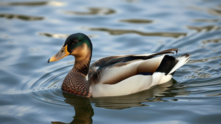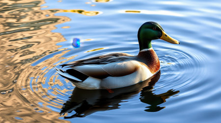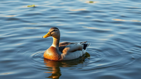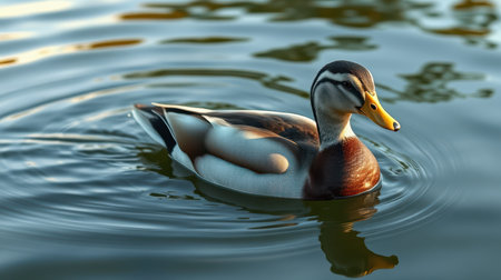 Majestic mallard duck swimming calmly in a serene lake during golden hour