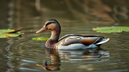 Mallard duck swimming peacefully in a tranquil pond surrounded by lily pads during a sunny day