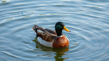 Mallard duck swimming peacefully in a tranquil pond surrounded by rippling water