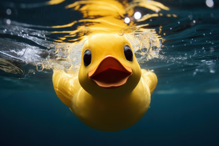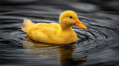 yellow duck floating on a dark blue sea, captured in a photographically detailed portrait. the vibrant colors of dark orange and light aquamarine create a saturated color field, reminiscent of the painterly style found in dutch tradition. this wildlife photograph was taken using the zeiss milvus 25mm f/1.4 ze lens, showcasing the beauty of nature in a visually striking composition. ai generated