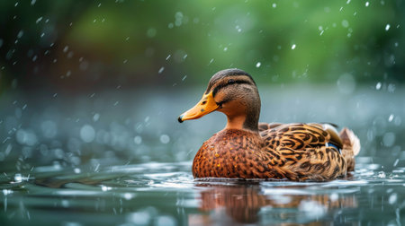a duck gracefully leaps through a water puddle, captured in a stunning vray-traced image. this hyper-detailed rendering showcases the realistic beauty of the scene. the photograph, taken with a wollensak 127mm f47 ektar lens, captures the charm of the duck's movement. the wild brushstrokes add an artistic touch to this captivating duckcore moment, evoking a sense of prairiecore aesthetics. ai generated