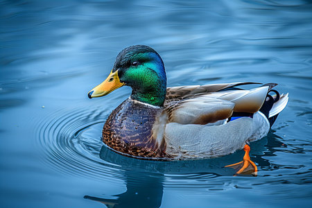 A mallard duck swimming on the water, with its head and tail visible above the surface of the blue lake. the bird has greenish-brown feathers around its neck, orange feet resting on its body, and a yellow beak with black edges at both ends. it is floating serenely, creating ripples as it glides thro