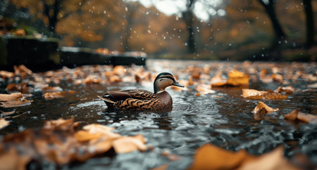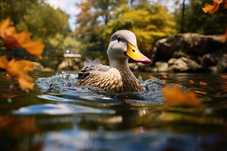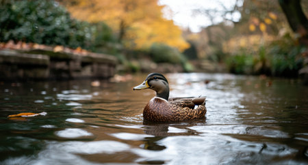 duck swimming in autumn pond