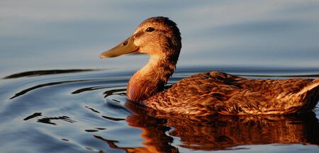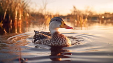 Duck swimming gracefully in a serene pond during golden hour at a peaceful nature reserve in springtime