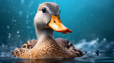 a duck swimming in a swimming pool, captured in a realistic animal portrait style using cinema4d. the image showcases a vibrant blend of light blue and amber tones, highlighting the intricate details of the duck's features. this macro photograph by igor zenin beautifully captures the strong facial expression of the duck, creating a visually striking composition. the use of rtx technology enhances the overall visual