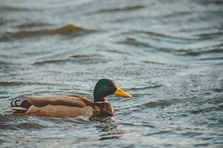 Mallard duck swimming in the lake, closeup of photo