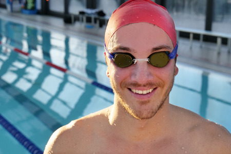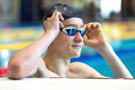 A teenage athlete improves swimming goggles in an indoor pool. Close up, selective focus.