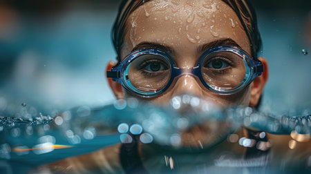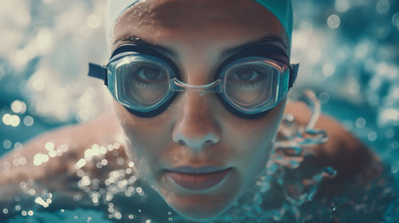 close-up swimmer's young woman face, wearing swim cap. goggles are covered with water droplets, and blurred background highlights swimmer's intense focus and determination AI generated