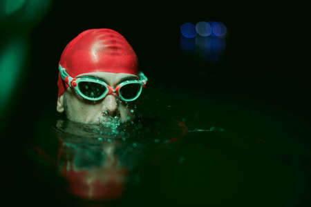 authentic triathlete swimmer having a break during hard training on night neon gel light