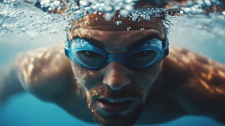 Professional swimmer doing laps underwater, with focused expression, clear goggles, and streamlined posture. Determined vibe
