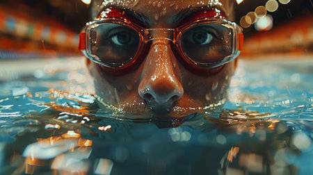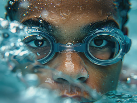 close-up shot of swimmer's face, wearing blue goggles and swim cap. goggles are covered with water droplets, and blurred background highlights swimmer's intense focus and determination AI generated